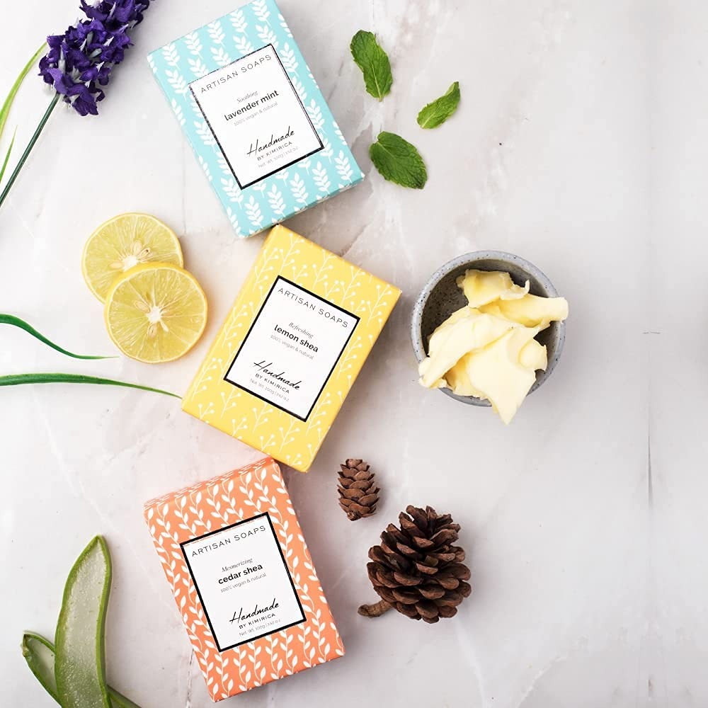 Description: Kimirica Artisan Soap Gift Box (Pack of 3) Lemon Shea, Cedar Shea and Lavender Mint (100gms. each)