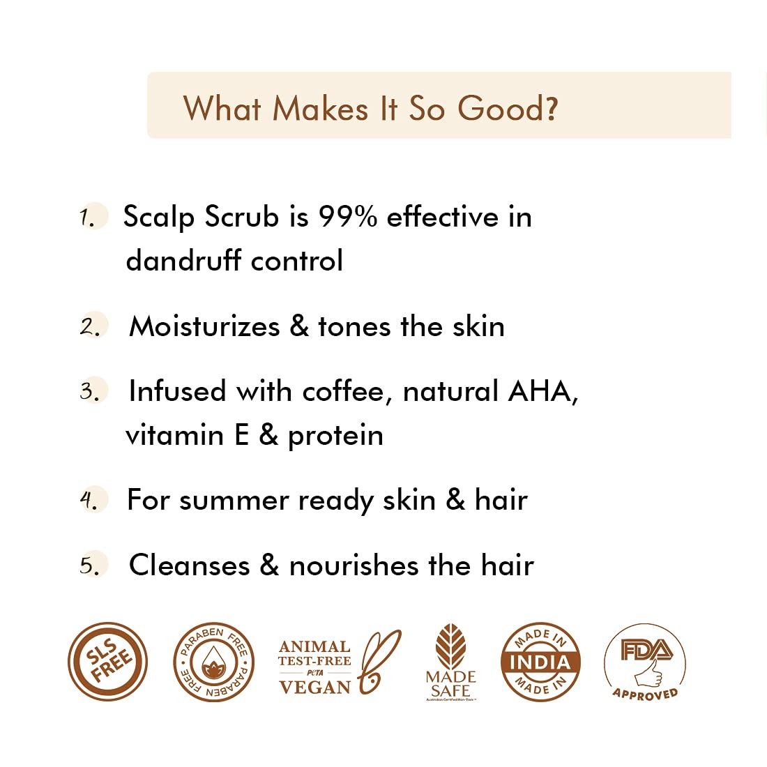 PURE COFFEE AND CAFFEINE INFUSED: Packed with all things Coffee, this summer combo pack is suitable for all skin & hair types. Coffee has Caffeine which is rich in antioxidants and tones the skin. Present in the scalp scrub & shampoo, Caffeine also stimulates the hair roots that improves blood circulation which boosts hair strength and controls hairfall. Scalp Scrub is 99% effective in dandruff control.
