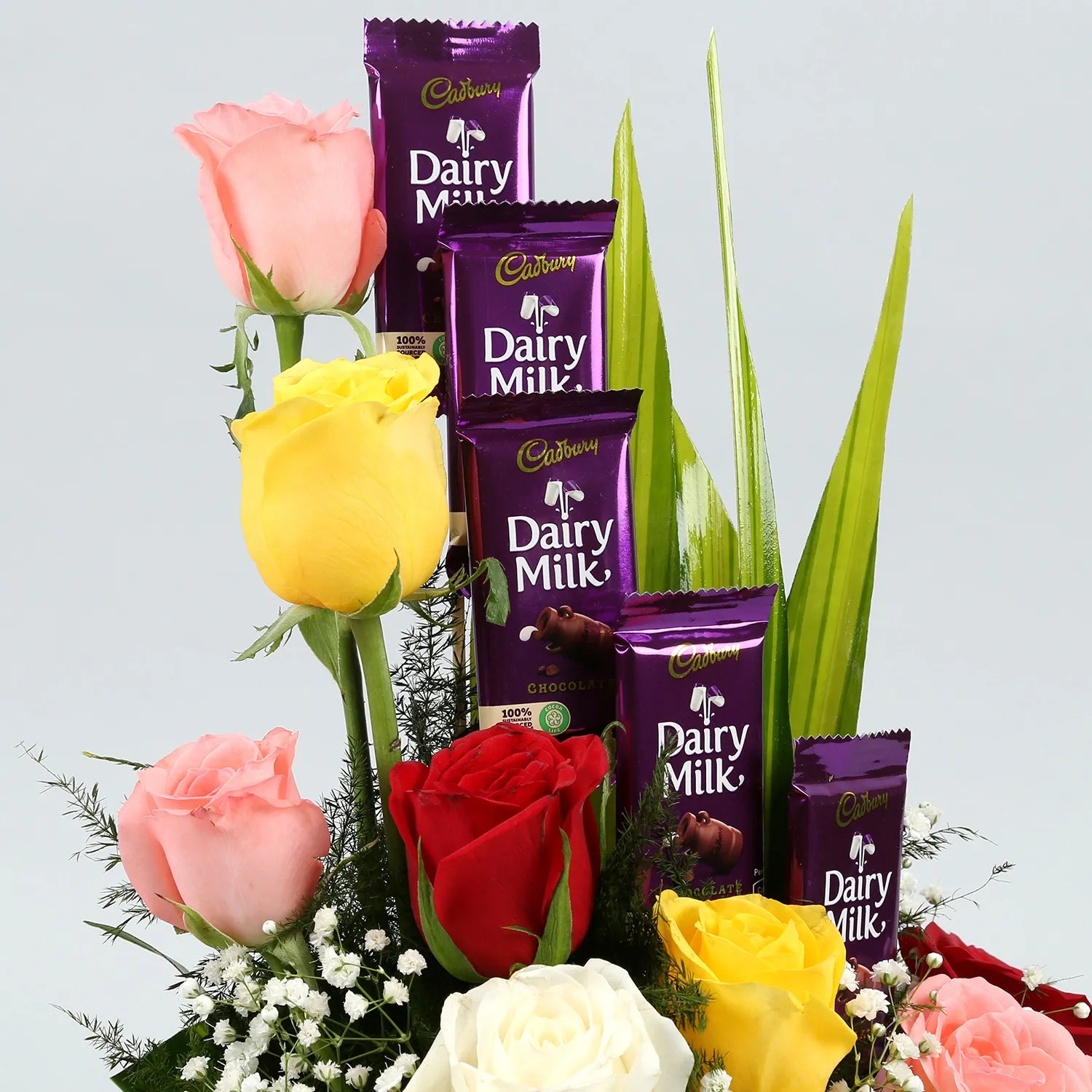 Description Product Details: 12 Mixed Roses 5 Dairy Milk Chocolates- 12.5 gms each Seasonal Fillers Cane Basket Flowers Trivia While everyone knows that red roses stand for true love & passion, they also signifies respect & appreciation. Did you know that the rose is edible, can live for a very long time, has been mentioned in the bible and is a great source of vitamin C?